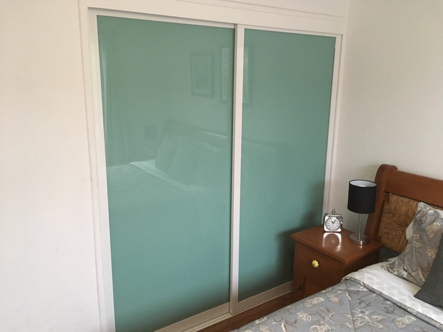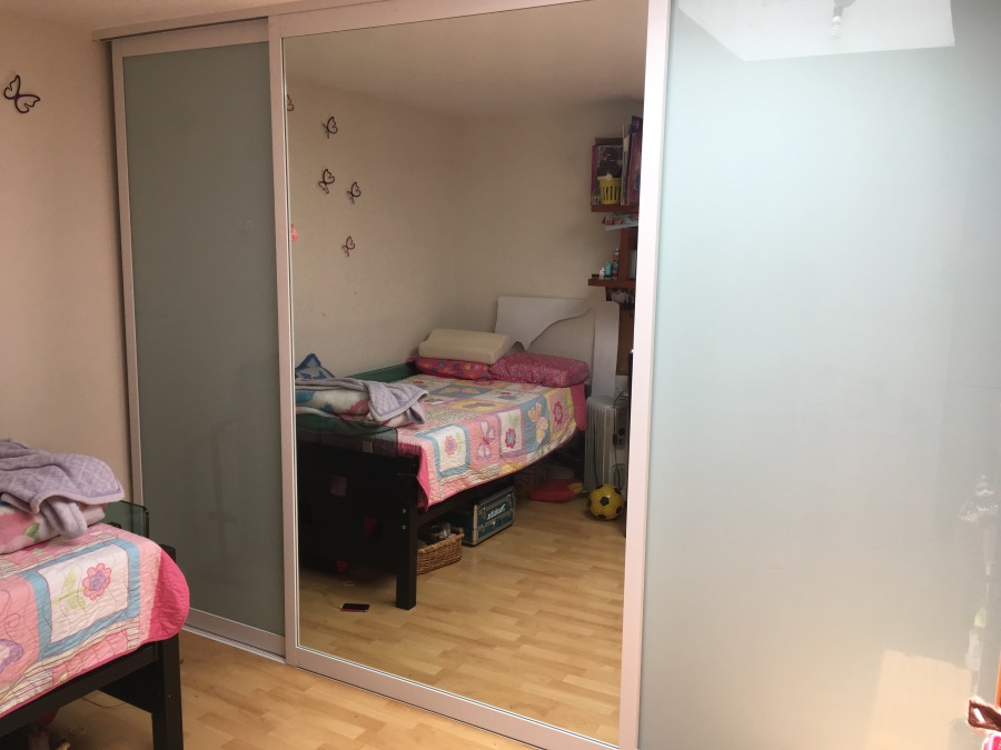 Cambiar las puertas de madera del closet por puertas corredizas de cristal claro de 6mm con película de seguridad en color blanco y espejo con película de seguridad. En aluminio blanco.